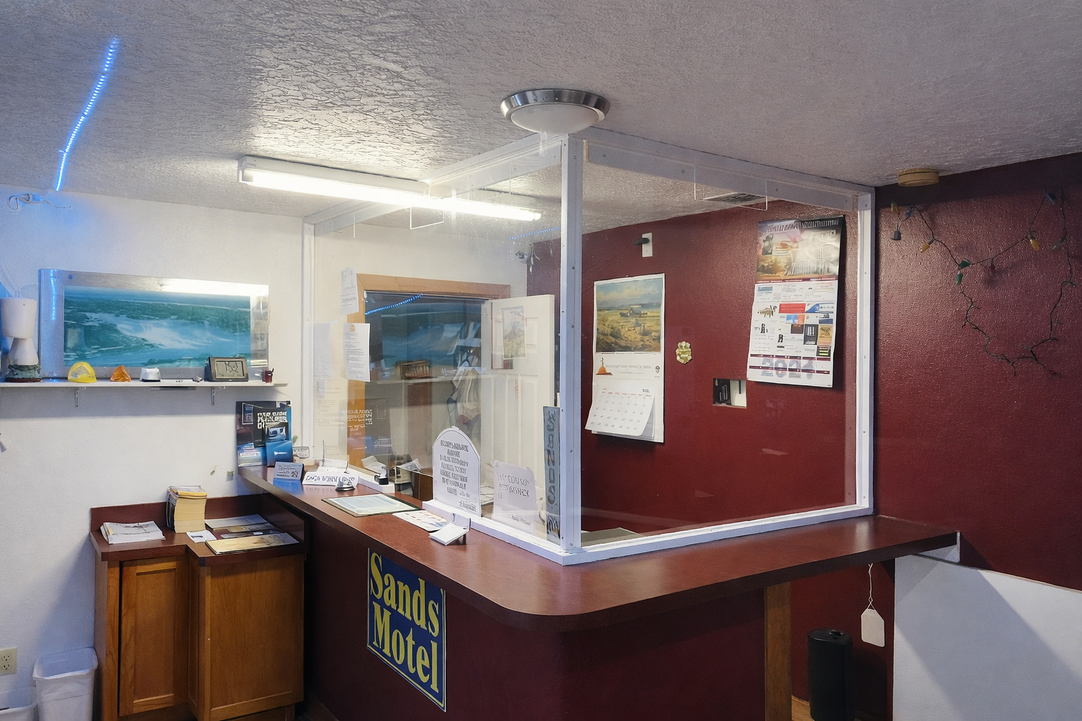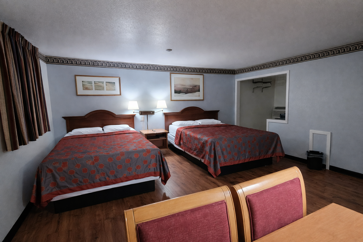 A simple hotel room with a wooden floor, a bed partially shown, a dresser, wall-mounted TV, desk with mirror and two red chairs, and a small framed picture on the wall.
